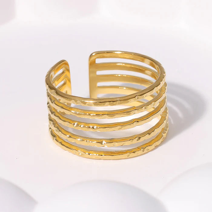 La bague LOUVRE RIVOLI ( aussi appelée Lilas ) est un bijou minimaliste avec quatre rayures striées et au style manchette.