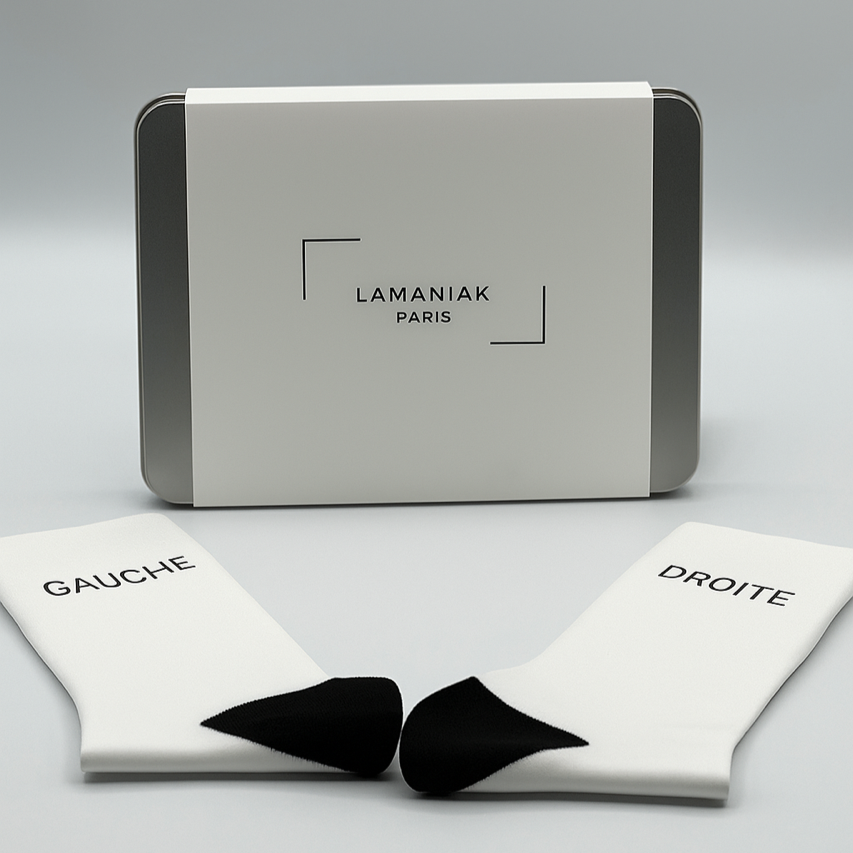 Les chaussettes unisexes blanches 100% coton sérigraphiées noires « GAUCHE / DROITE » avec le fameux logo LAMANIAK Paris au verso.