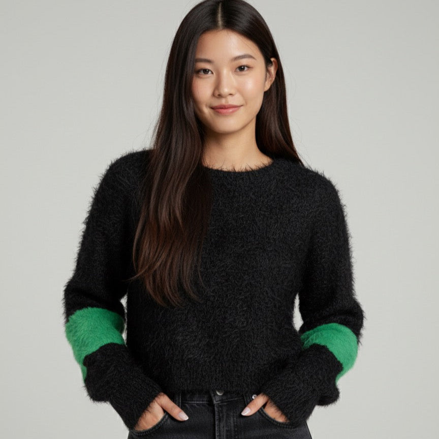 Pull noir et vert effet fourrure EN PRÉCOMMANDE